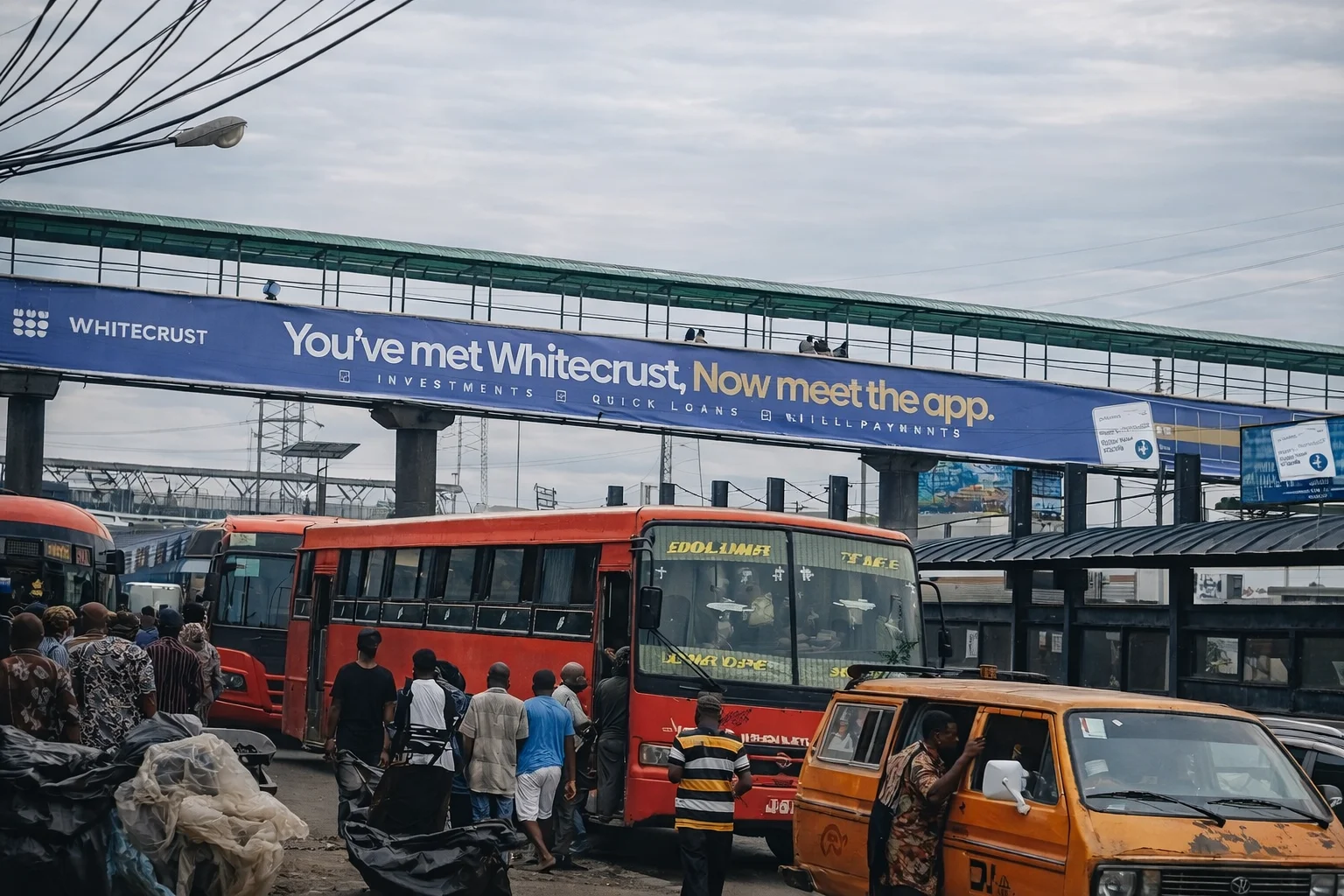 A public transport bus moves through a congested Lagos street as commuters cling to its exterior, positioning themselves mid-motion. One figure leans forward, preparing to board while the vehicle is already in transit. The scene captures the urgency of urban movement, where the boundary between standing still and moving forward collapses into a single moment of decision.