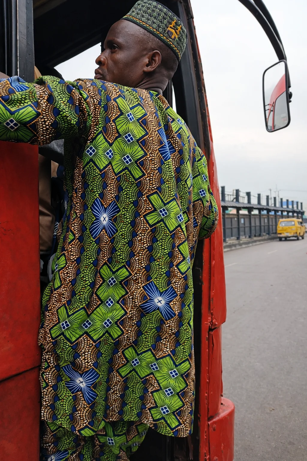 A commuter grips the side of a moving vehicle as it advances through the city, suspended between departure and arrival. Surrounding traffic and pedestrians blur into the background, reinforcing the sense of relentless motion. The image highlights the endurance and resolve embedded in everyday travel, revealing how mobility in Lagos often demands risk and precision.