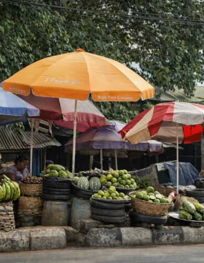 Across the series, fruit appears arranged in baskets, stacked on tyres, spread across tables, balanced in wheelbarrows, or carried through traffic. These varied methods of display and transport respond to location, visibility, and access, revealing trade as adaptive rather than fixed. Markets and roadsides operate as connected spaces within a wider network of circulation.